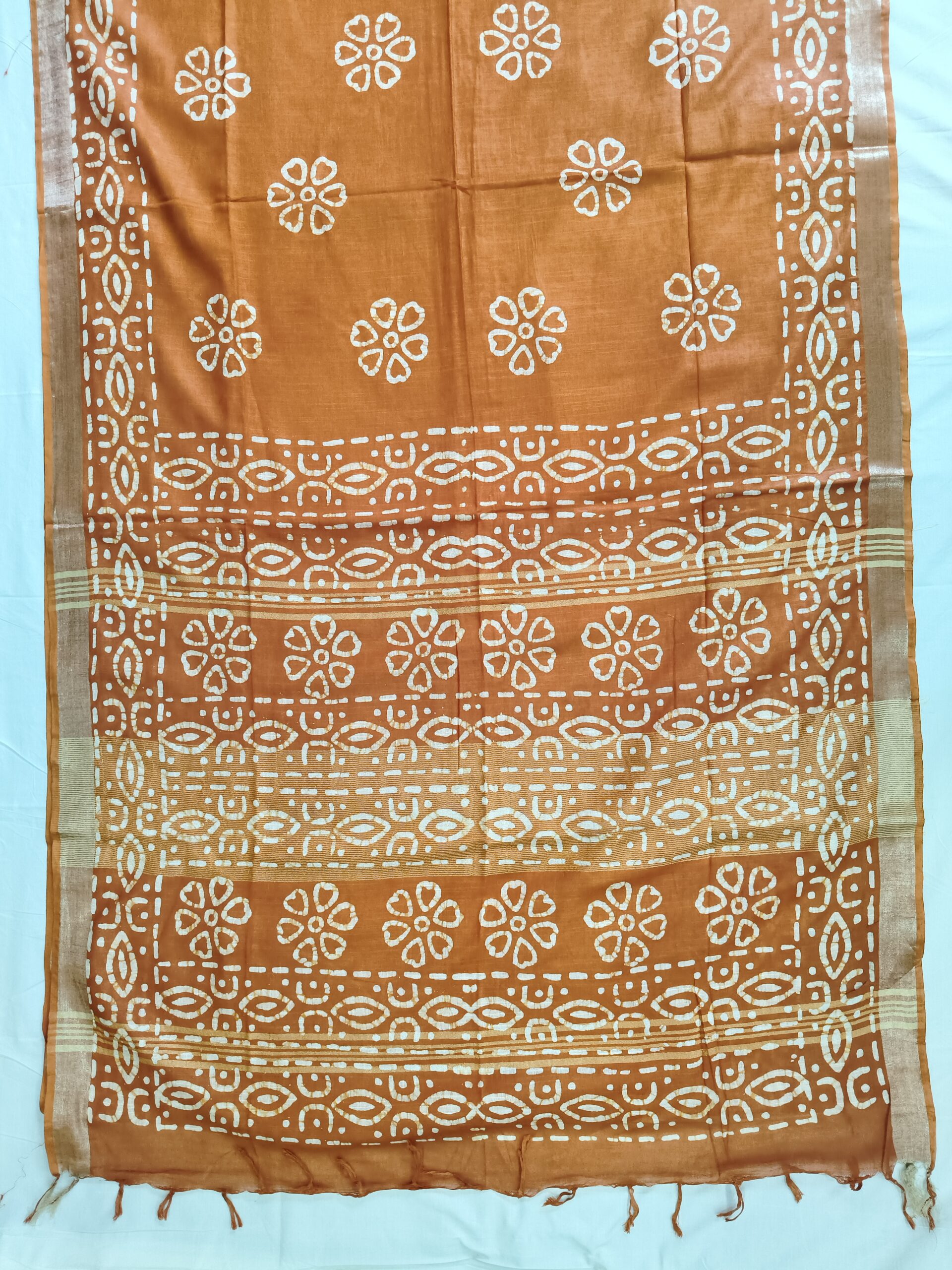 Pure Cotton Hand Block Batik Print Saree With Blouse Pcs-Brown