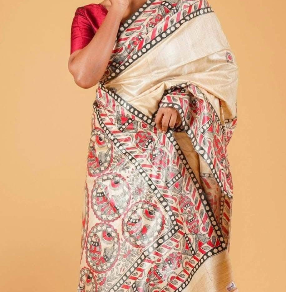 Desi Tussar Silk Madhubani Hand Painted Saree