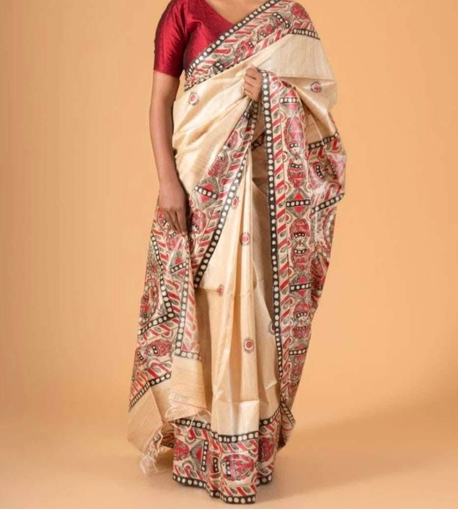 Embrace the rich cultural heritage of India with the desi tussar silk saree, featuring hand-painted Madhubani artwork.