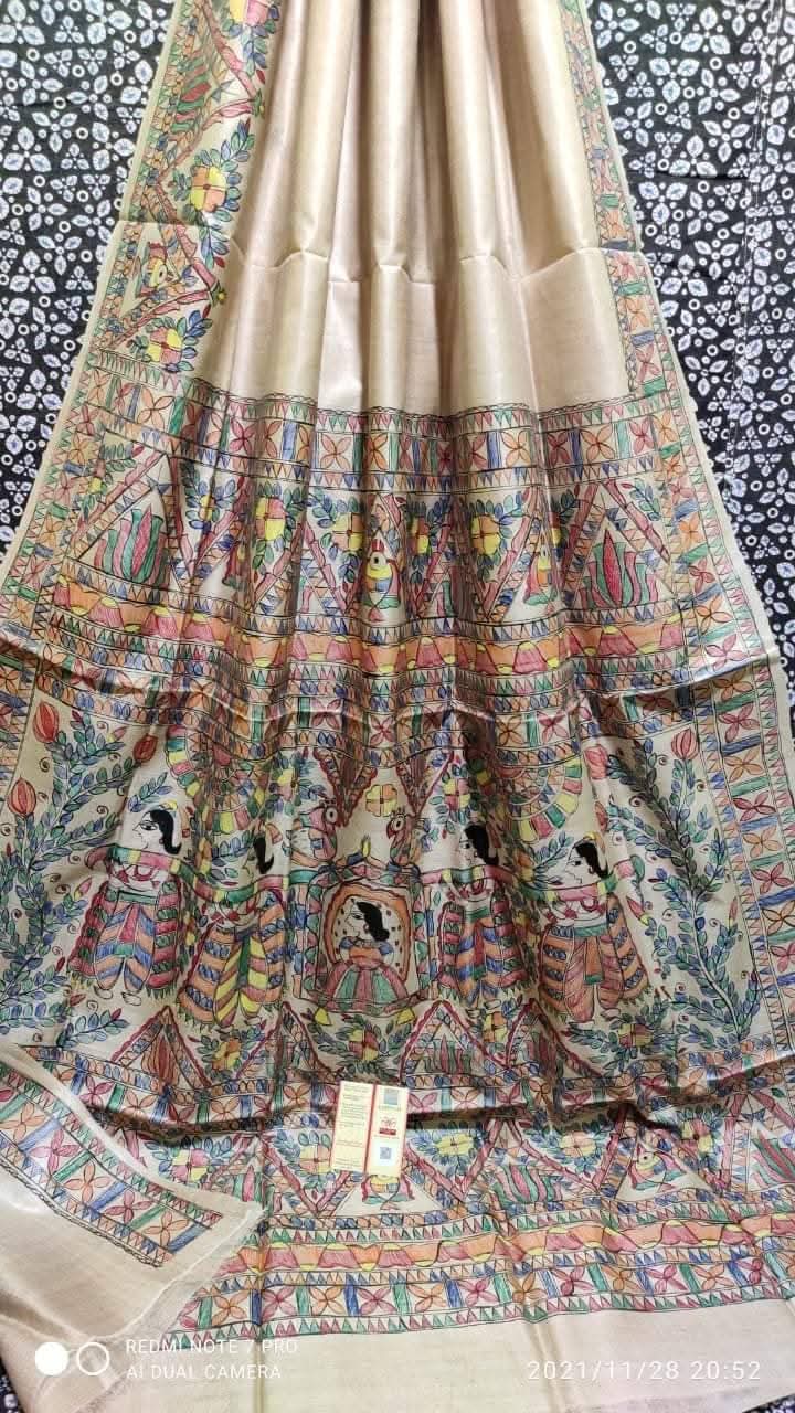 Embrace the rich cultural heritage of India with the desi tussar silk saree, featuring hand-painted Madhubani artwork.