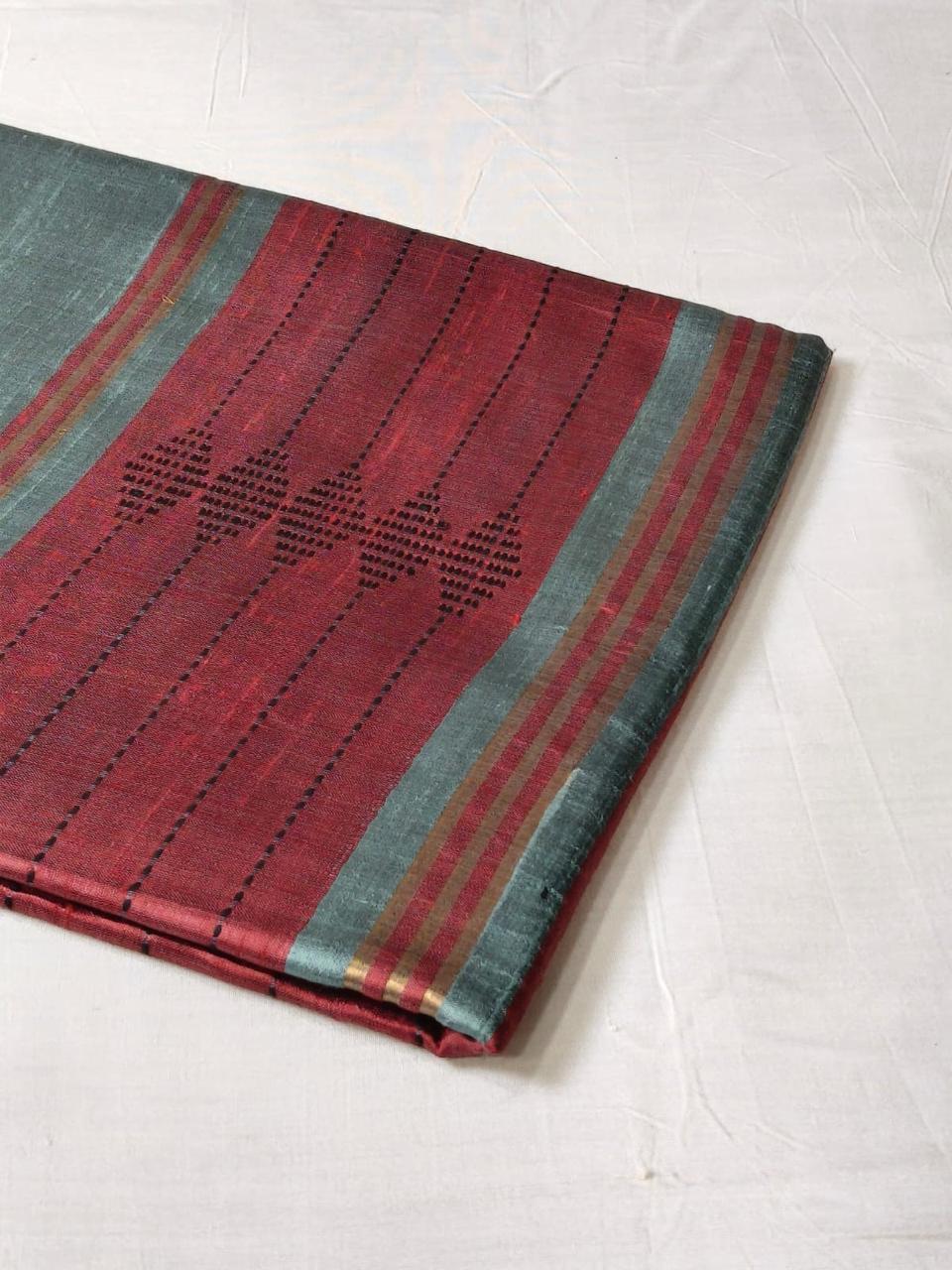 This saree is specially hand woven with raw silk fibre which gives lustrous look and shimmer to the cloth. Presenting you beautifully woven Dupion silk.