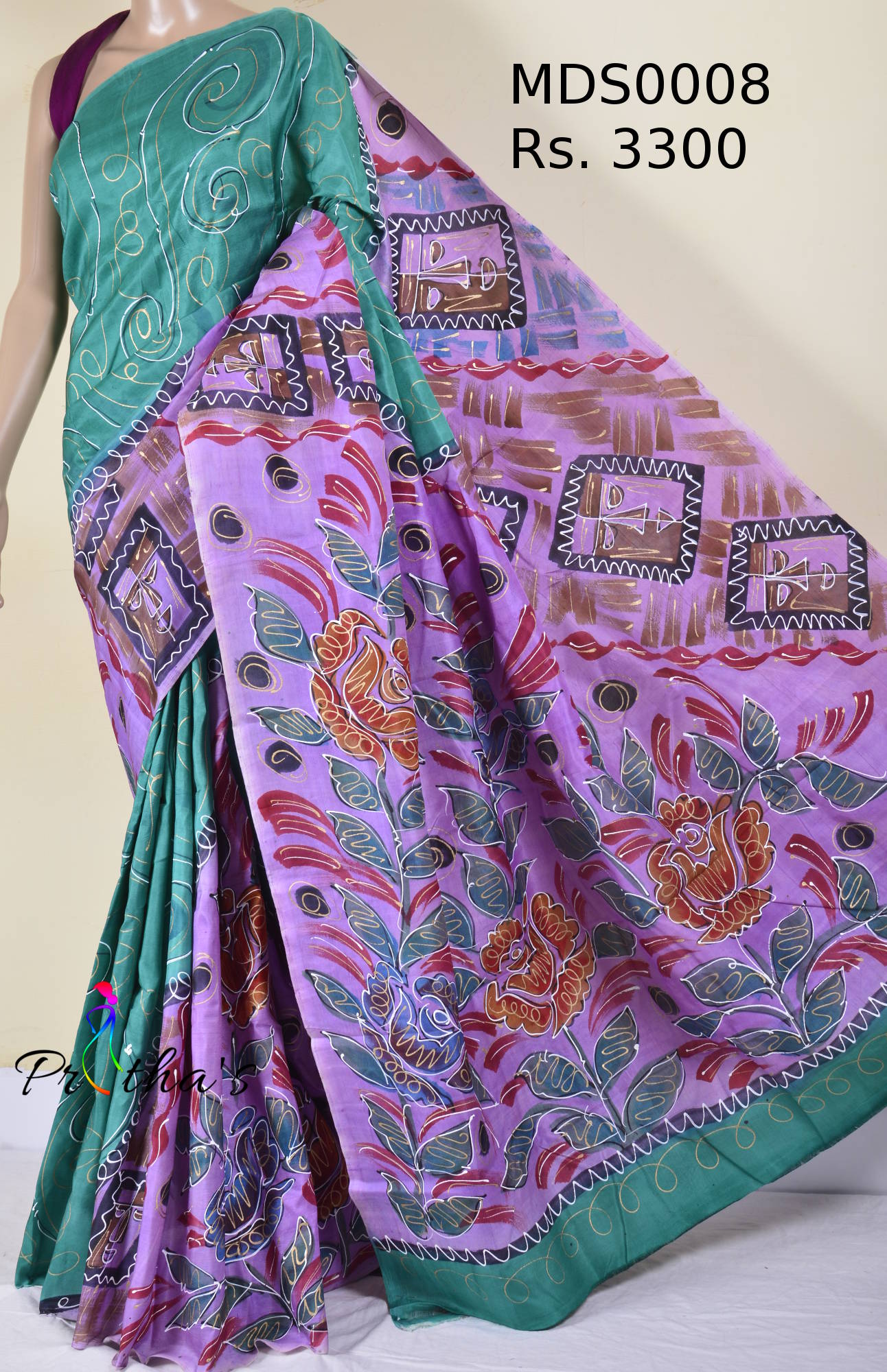 Hand painted Mulberry Silk Saree. Also known as Murshidabad Silk Saree. Hand painted floral and other motifs on magneta and turquish green background gives a crispy look and feel.