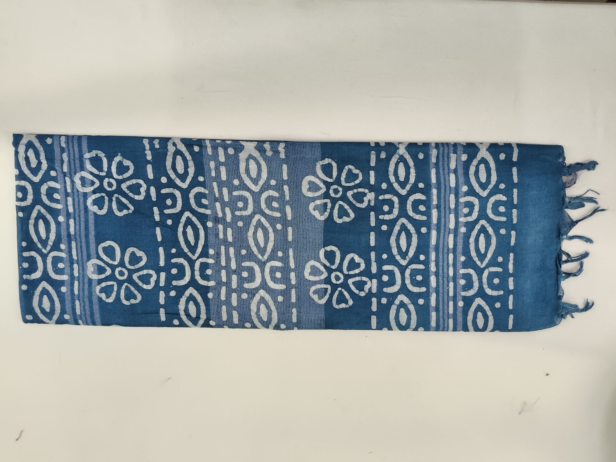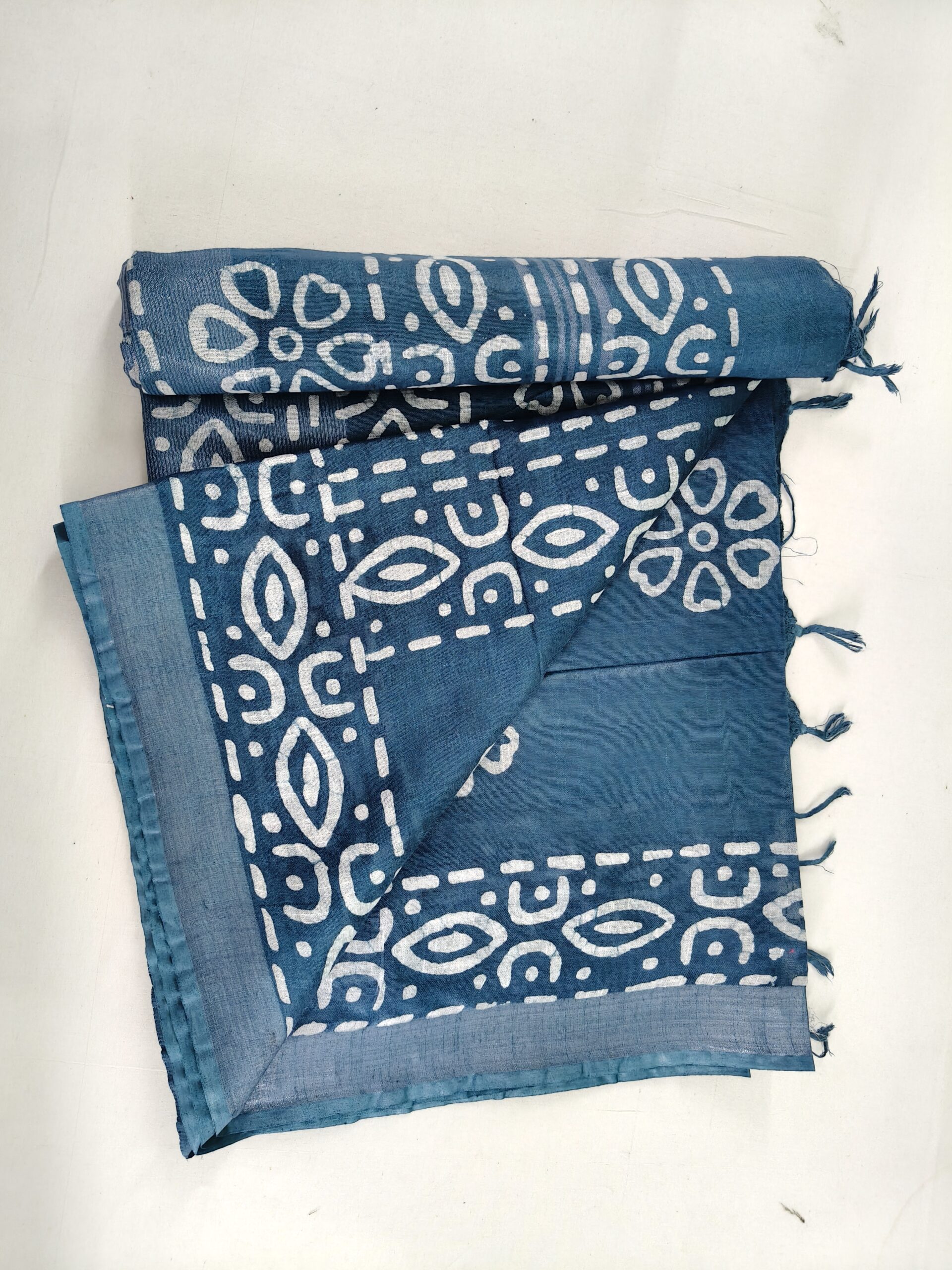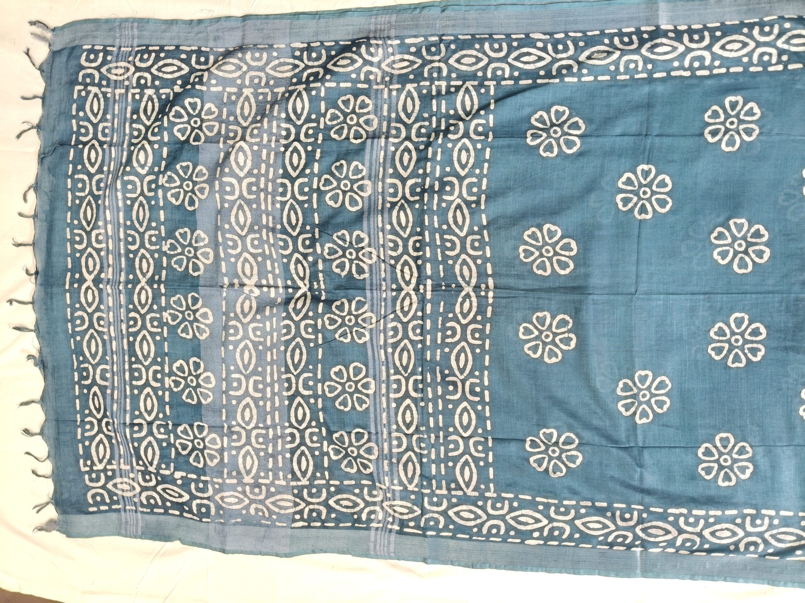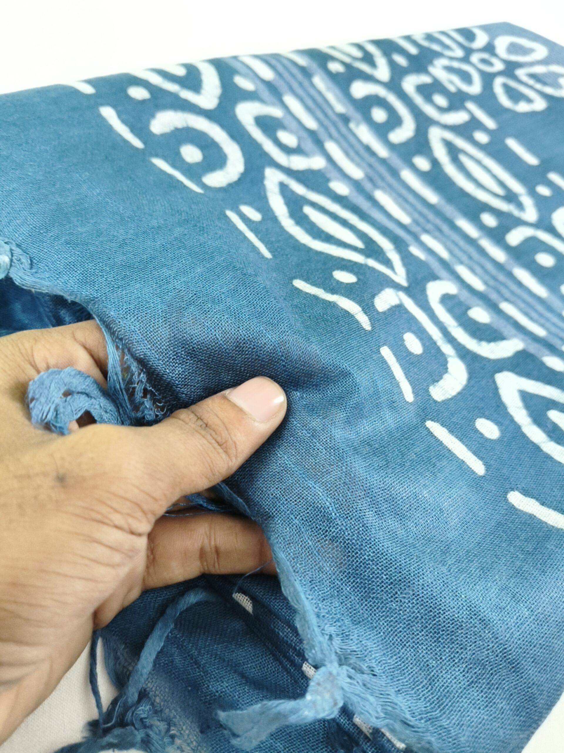 Pure Cotton Hand Block Batik Print Saree With Blouse Pcs-Blue