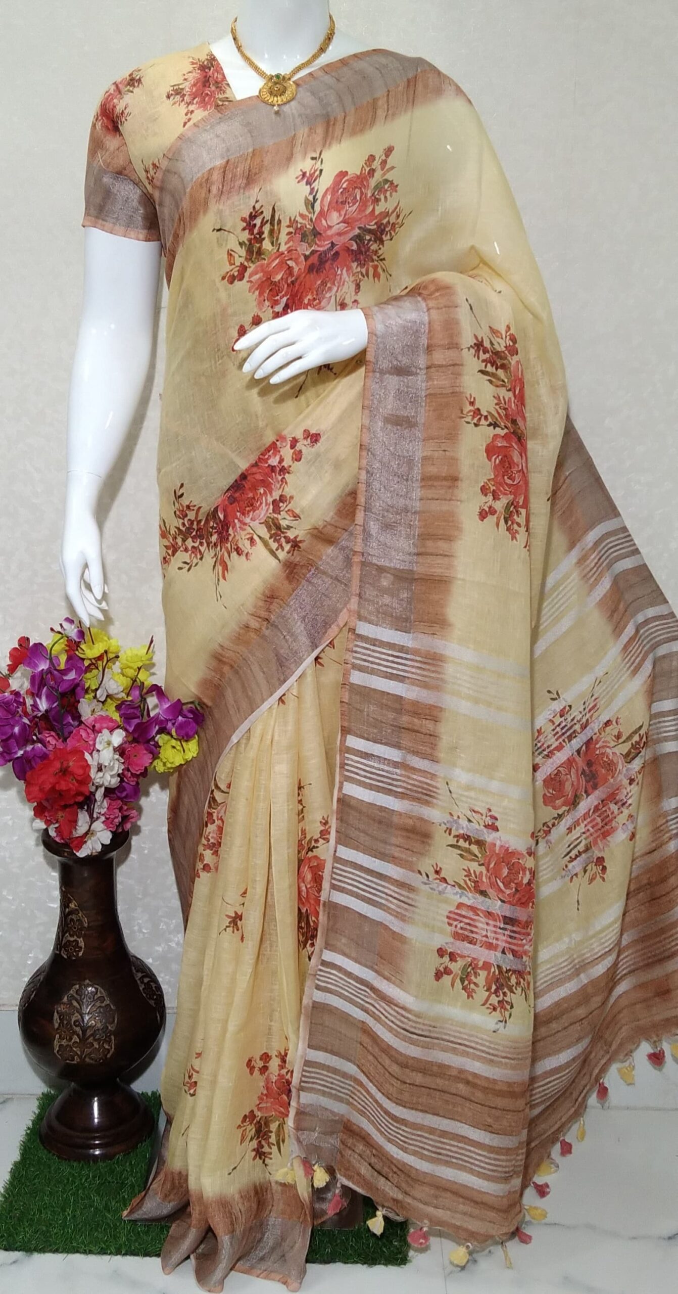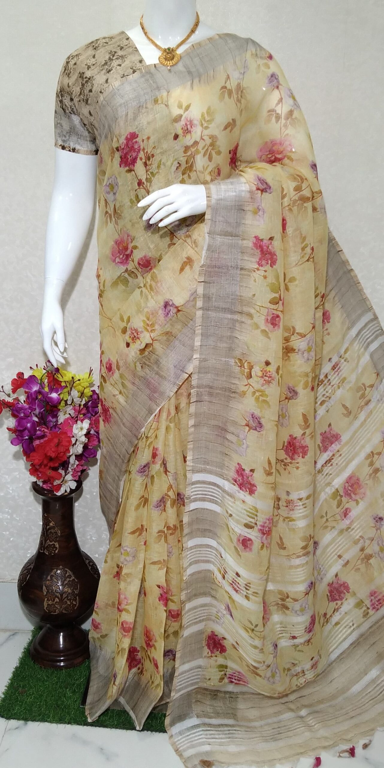 Pure linen digital print saree : This gorgeous linen saree with a digital printed floral design is the perfect addition to your ethnic wear collection. The intricate floral design is digitally printed on the soft and lightweight linen fabric, creating a vibrant and eye-catching pattern that is sure to turn heads. The zari border adds a touch of elegance and sophistication to the saree, making it ideal for formal occasions such as weddings, parties, and other celebrations.