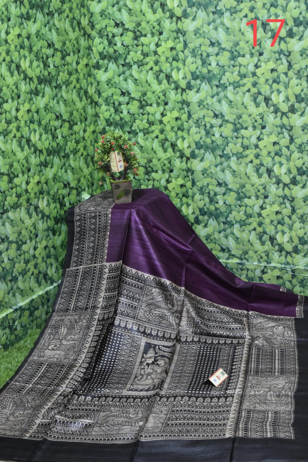 Madhubani hand painted Pure Tussar Silk Sari with blouse piece. Unique design Madhubani Sari.Saree with blouse piece. Madhubani design sari on pure tussar silk.