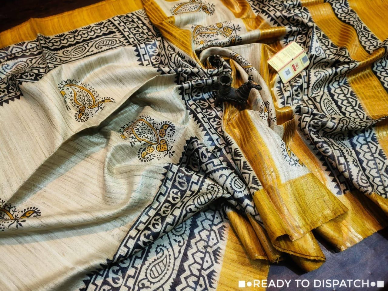 Madhubani hand painted Pure Tussar Silk Sari with blouse piece. Unique design Madhubani Sari.Saree with blouse piece. Madhubani design sari on pure tussar silk.