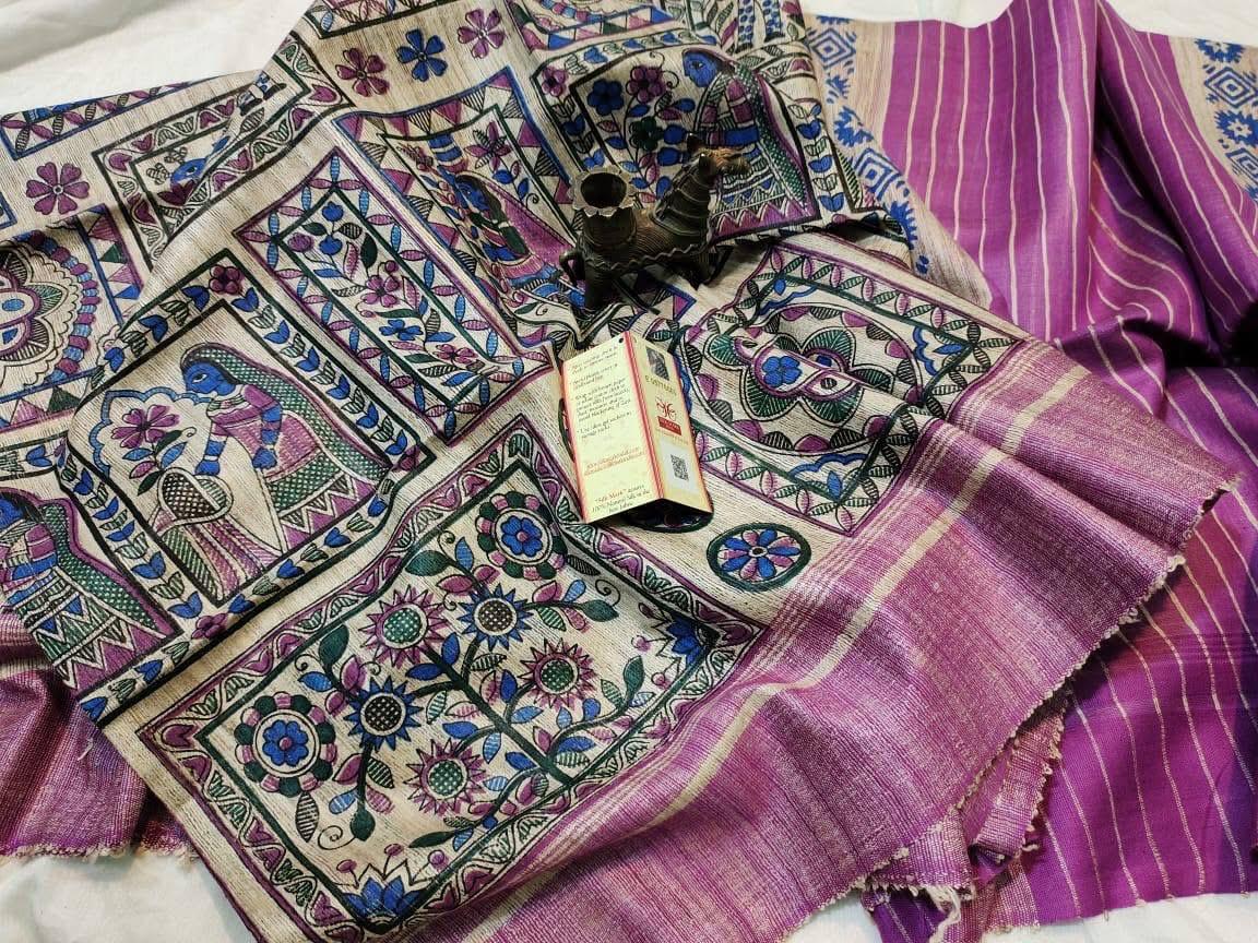 Screen Printed Pure Tussar Ghicha Silk Sari with blouse piece. Unique design on tussar silk.