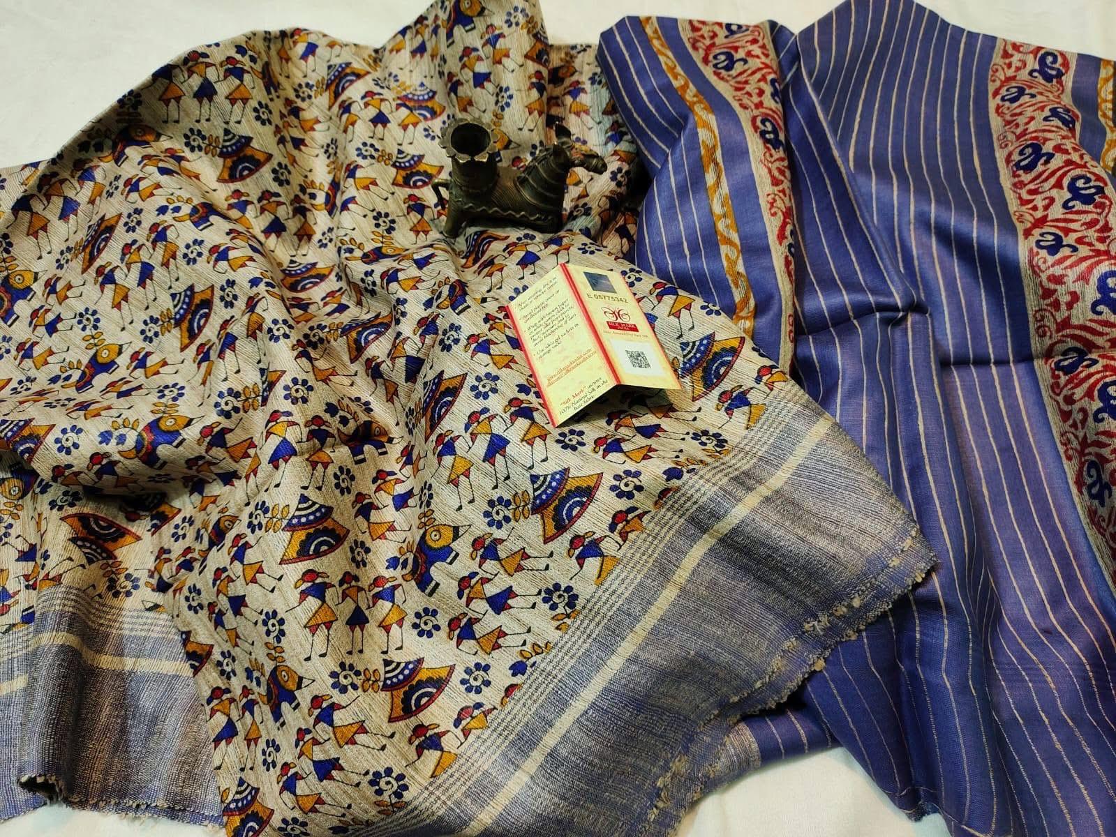 Madhubani print Pure Tussar Silk Sari with blouse piece. Unique design Madhubani Sari.Saree with blouse piece. Madhubani design sari on pure tussar silk.