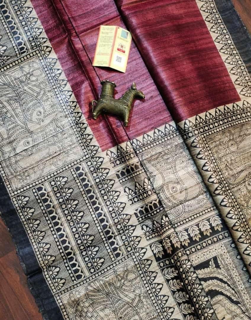 Madhubani print Pure Tussar Silk Sari with blouse piece. Unique design Madhubani Sari.Saree with blouse piece. Madhubani design sari on pure tussar silk.