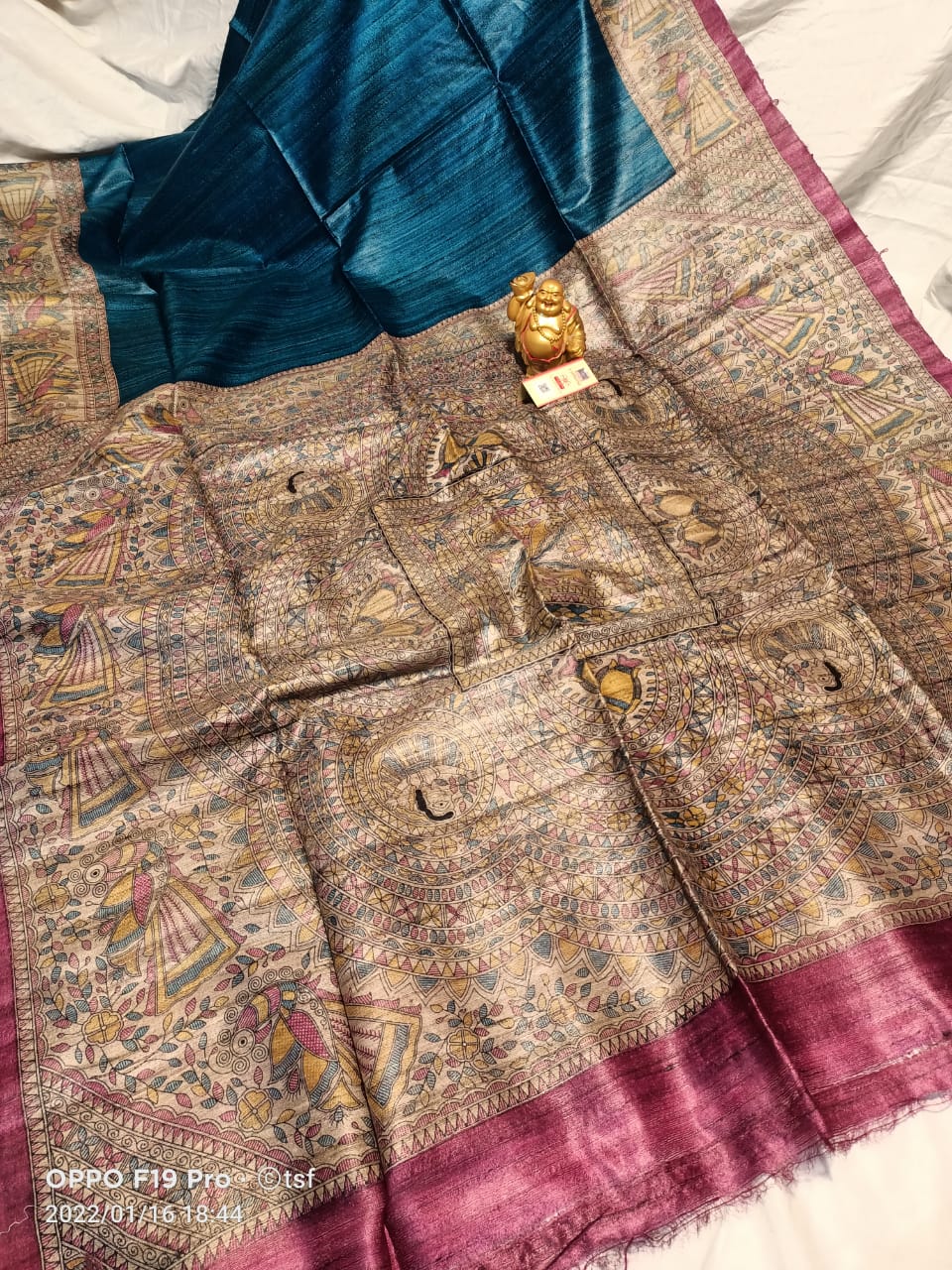 Madhubani hand painted Pure Tussar Silk Sari with blouse piece. Unique design Madhubani Sari.Saree with blouse piece. Madhubani design sari on pure tussar silk.
