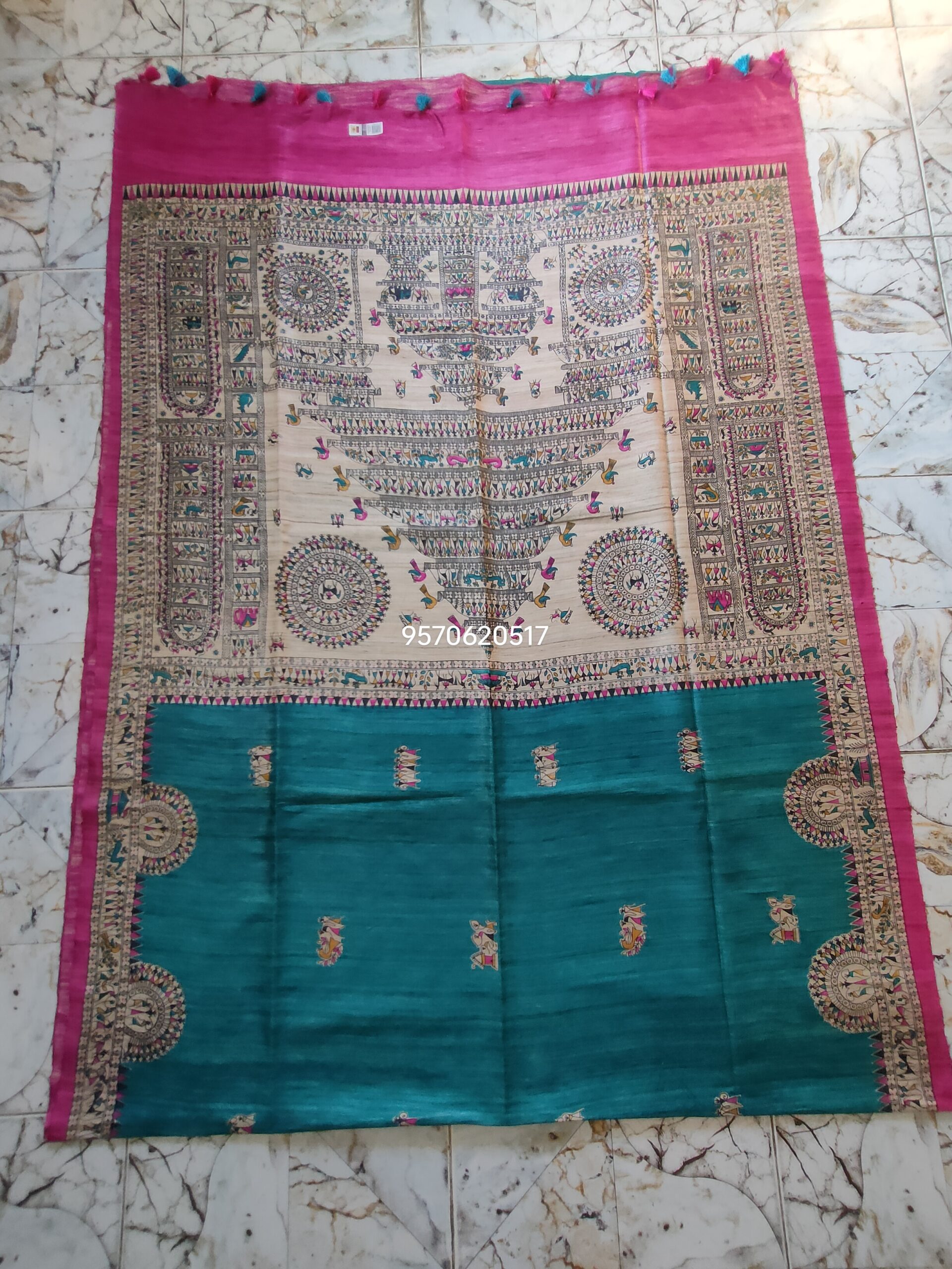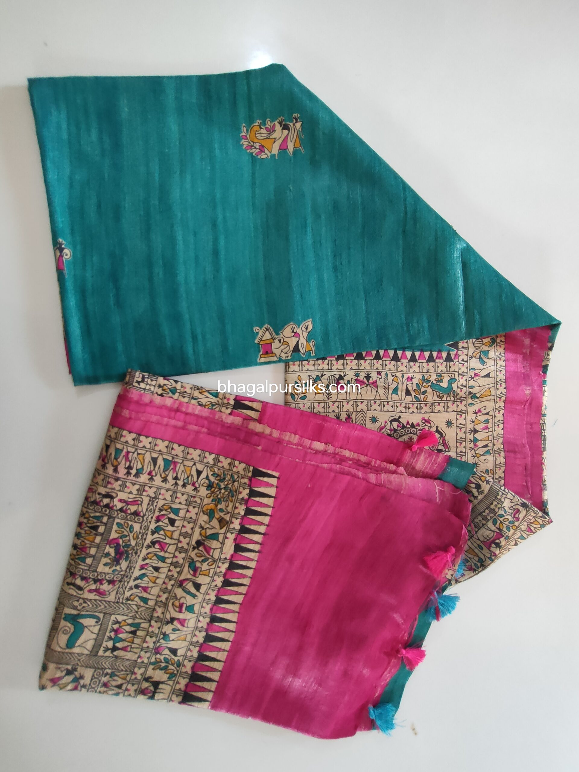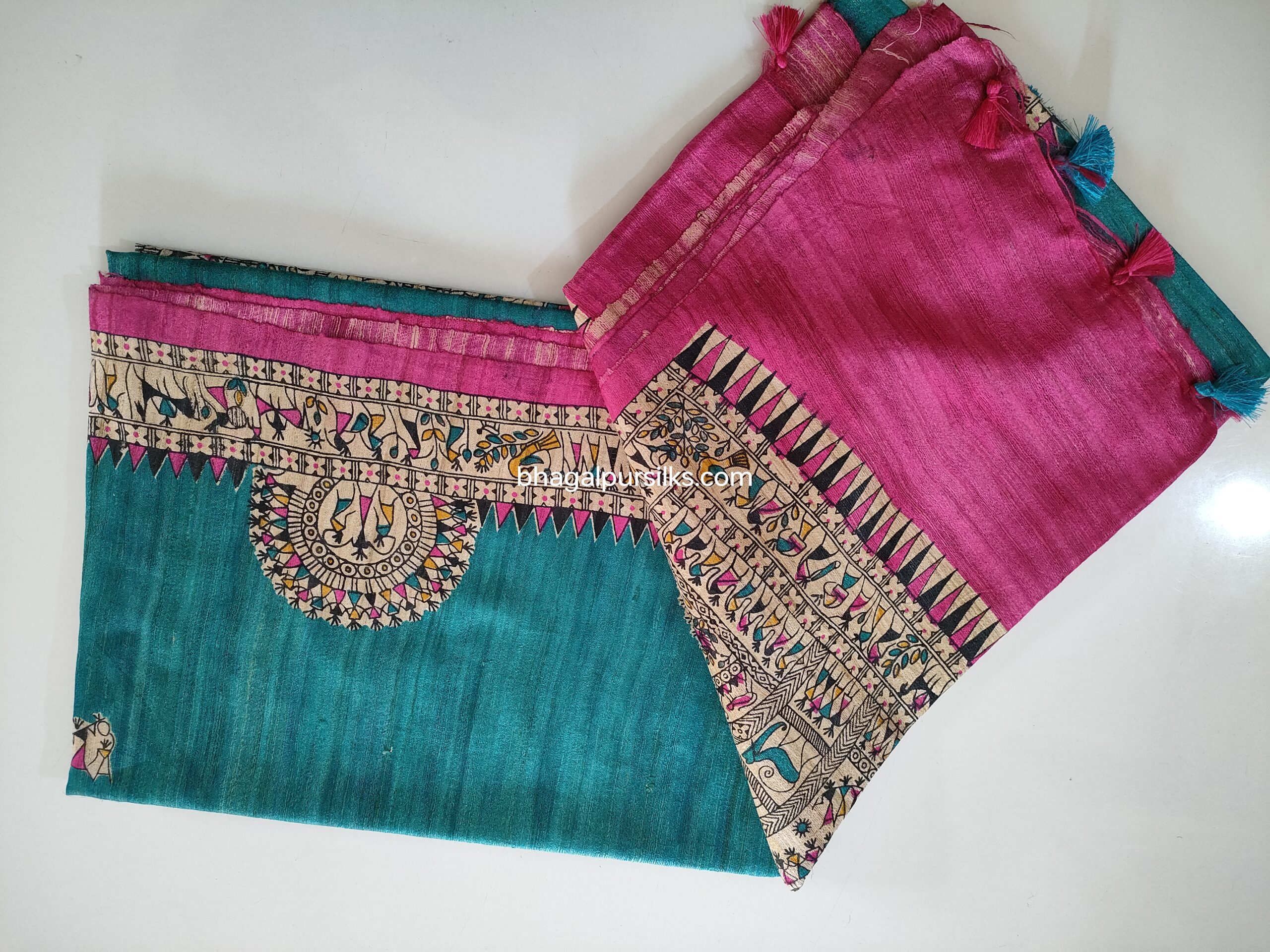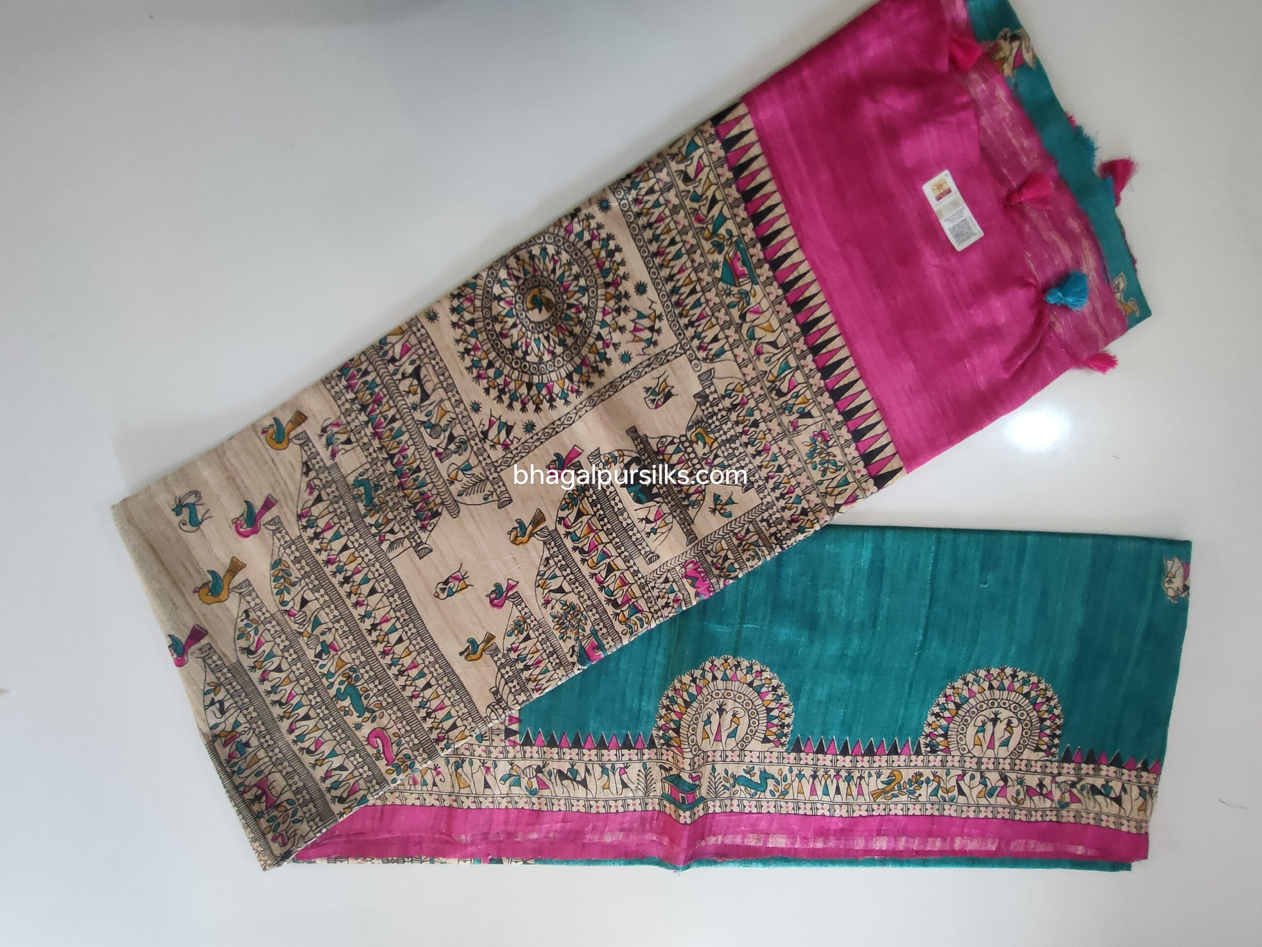 Madhubani print Pure Tussar Silk Sari with blouse piece. Unique design Madhubani Sari.Saree with blouse piece. Madhubani design sari on pure tussar silk.
