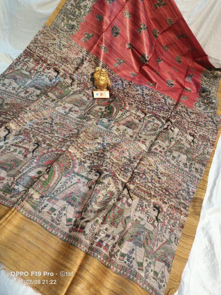 Madhubani hand painted Pure Tussar Silk Sari with blouse piece. Unique design Madhubani Sari.Saree with blouse piece. Madhubani design sari on pure tussar silk.