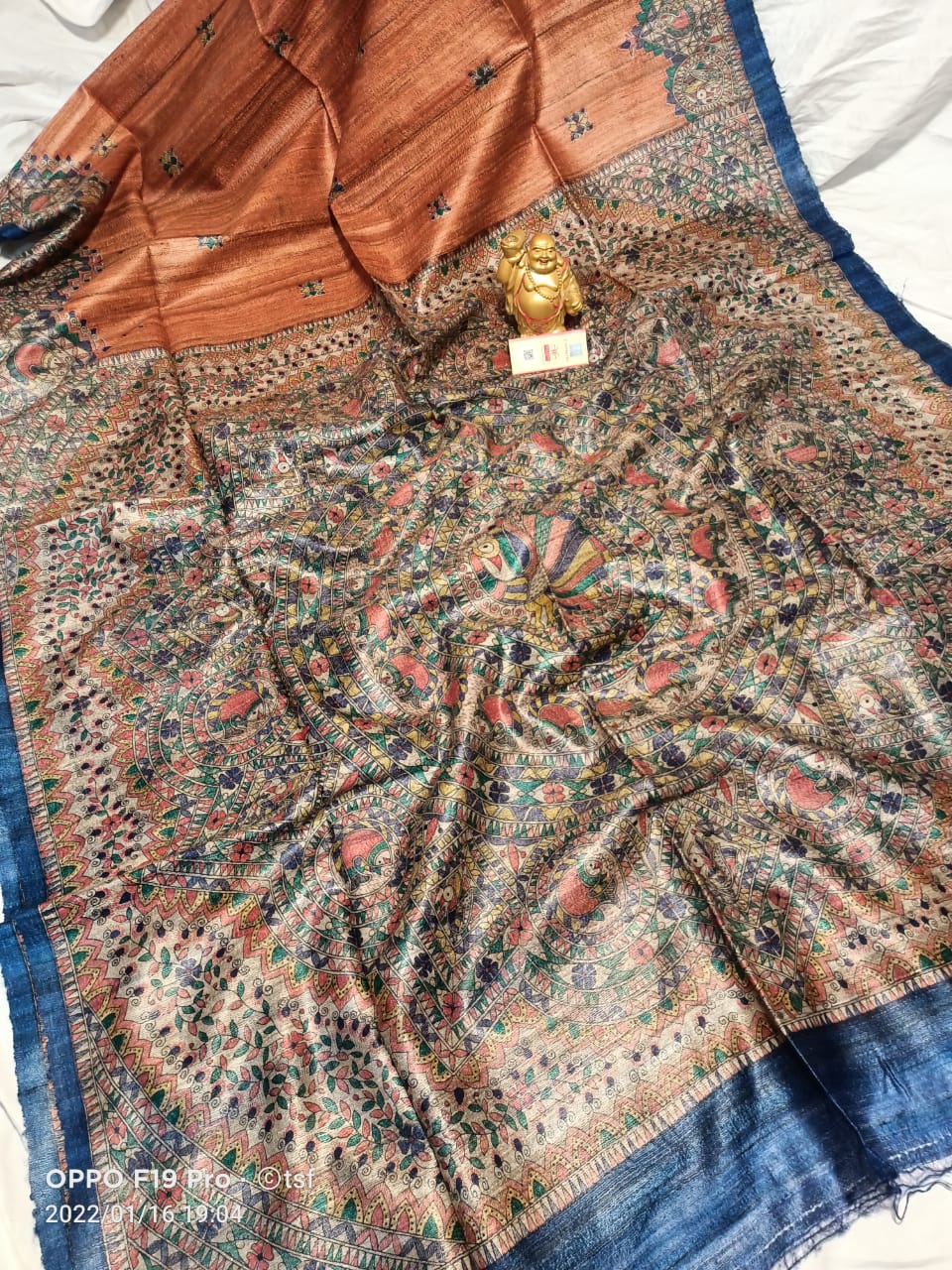 Madhubani hand painted Pure Tussar Silk Sari with blouse piece. Unique design Madhubani Sari.Saree with blouse piece. Madhubani design sari on pure tussar silk.