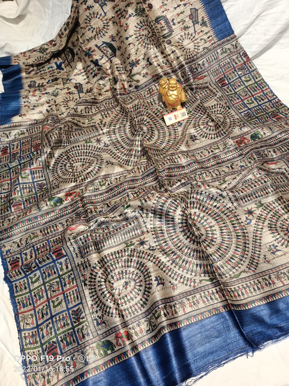 Madhubani hand painted Pure Tussar Silk Sari with blouse piece. Unique design Madhubani Sari.Saree with blouse piece. Madhubani design sari on pure tussar silk.