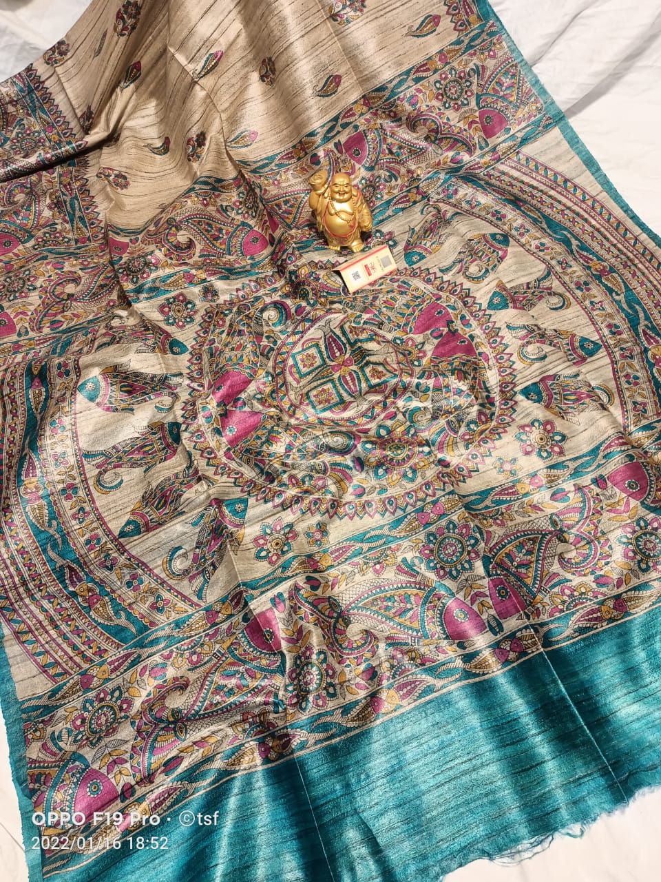 Madhubani hand painted Pure Tussar Silk Sari with blouse piece. Unique design Madhubani Sari.Saree with blouse piece. Madhubani design sari on pure tussar silk.