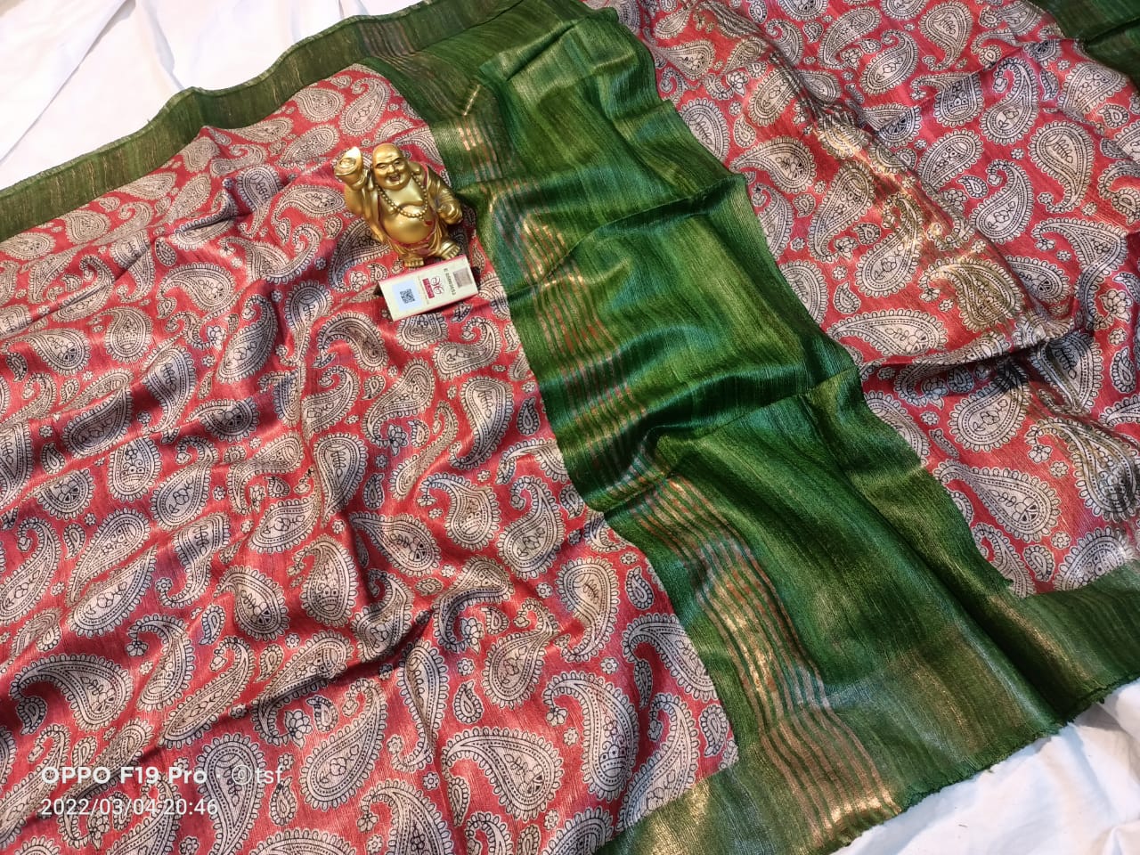Pure Tussar Ghicha Silk Sari with blouse piece. Unique design .Saree with blouse piece. Printed design sari on tussar ghicha silk.