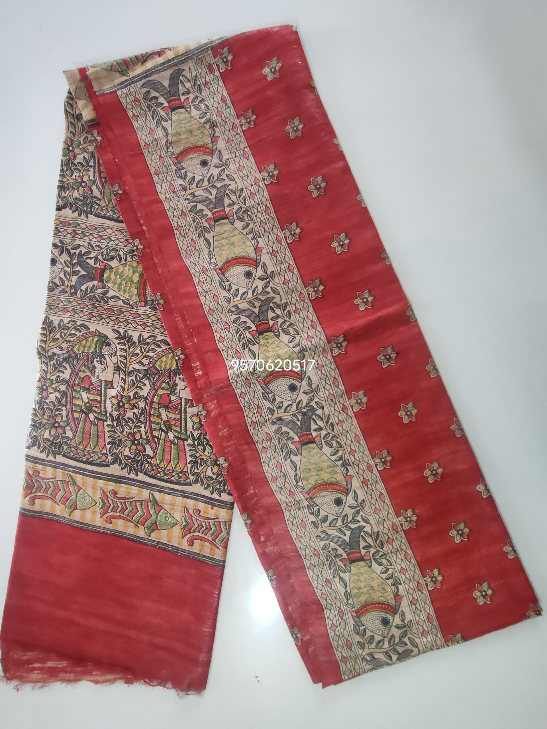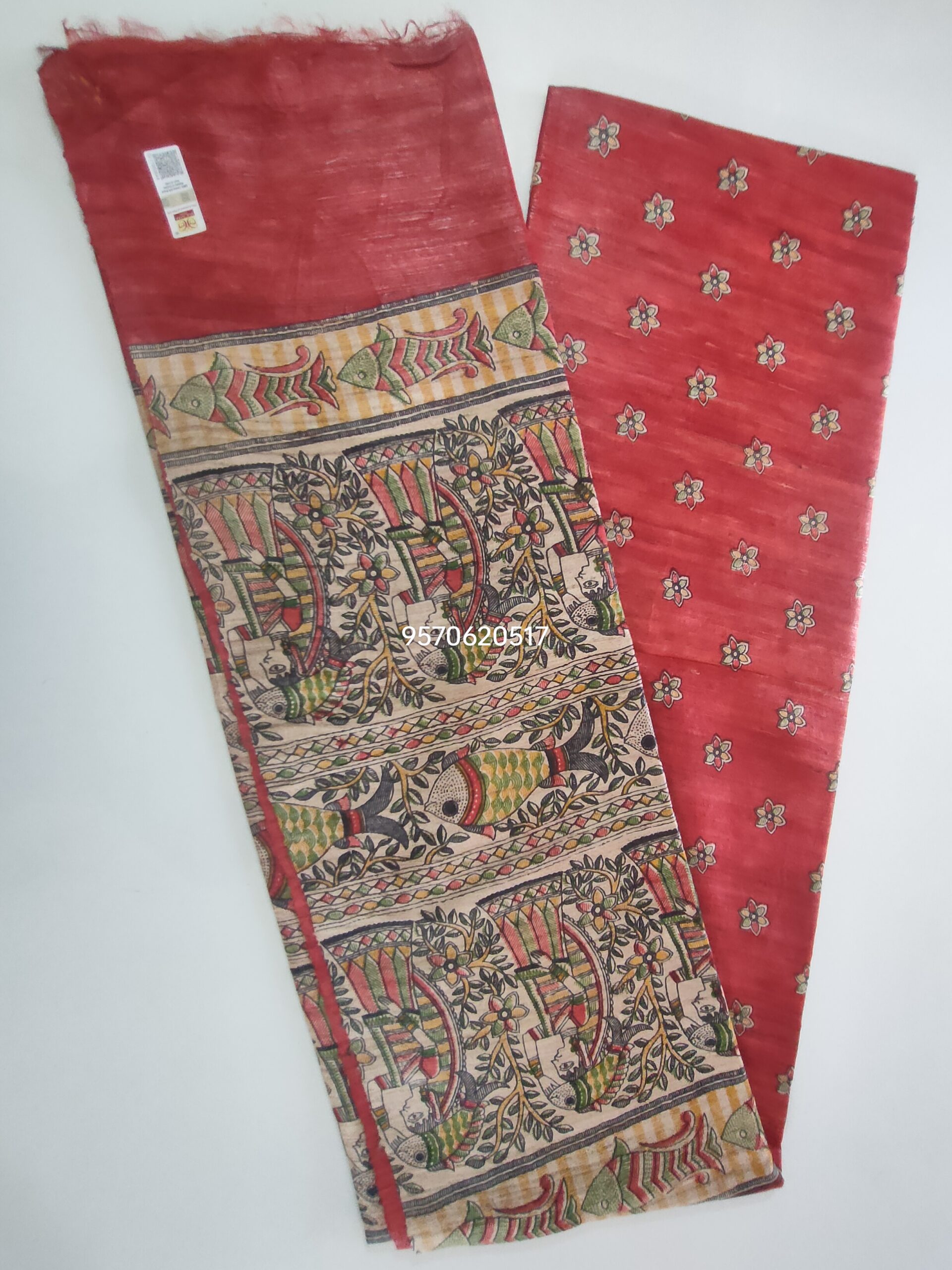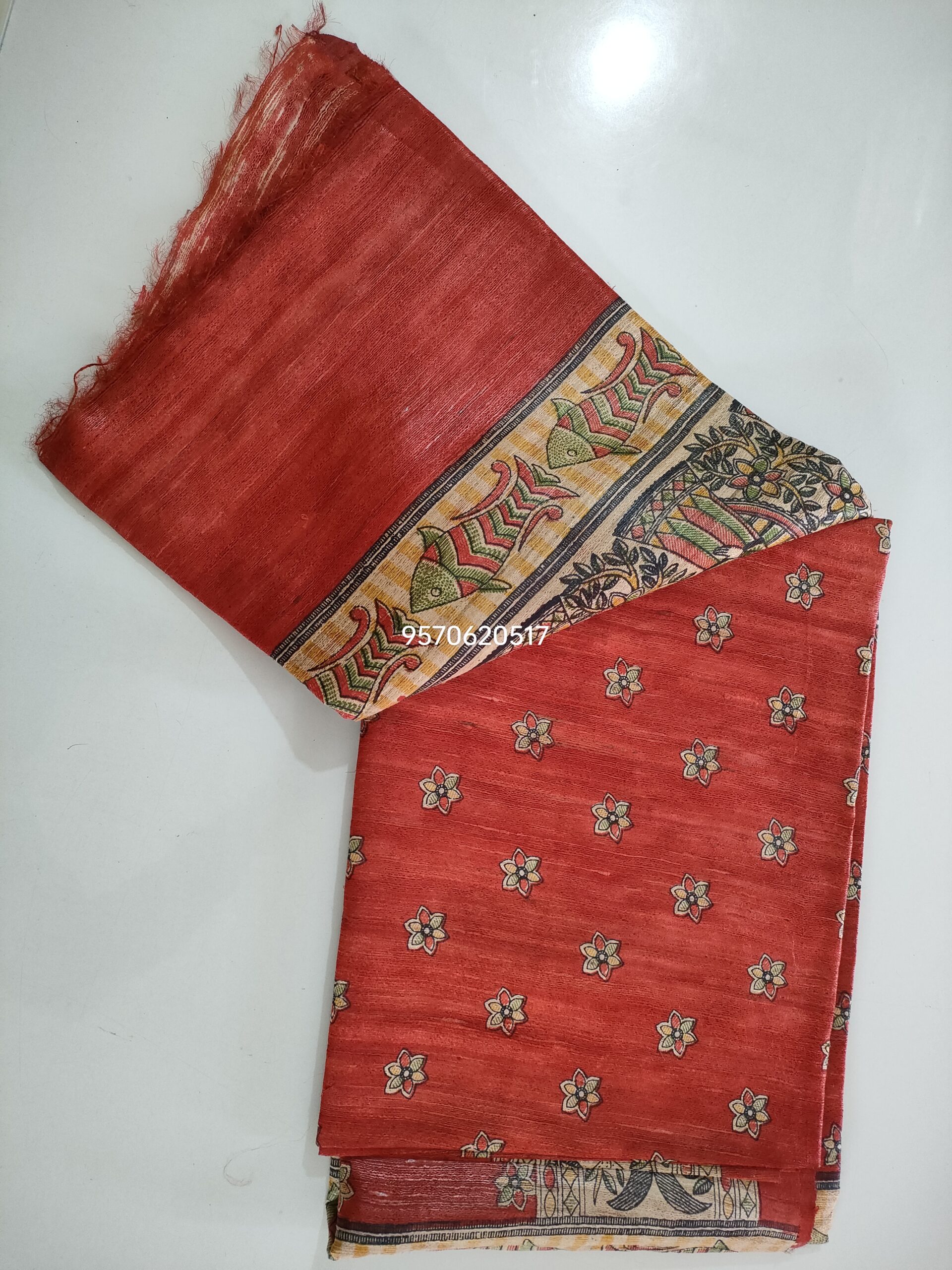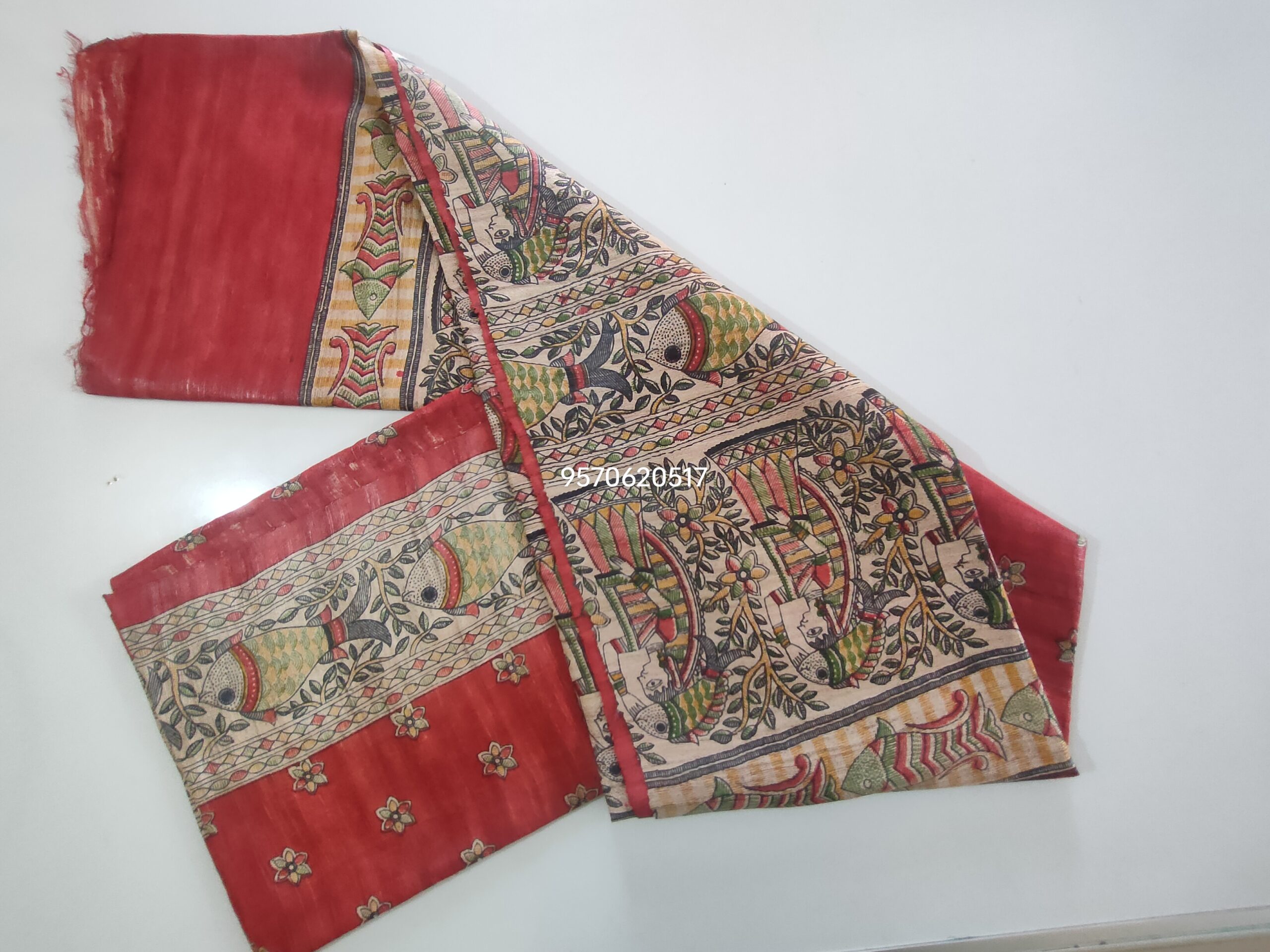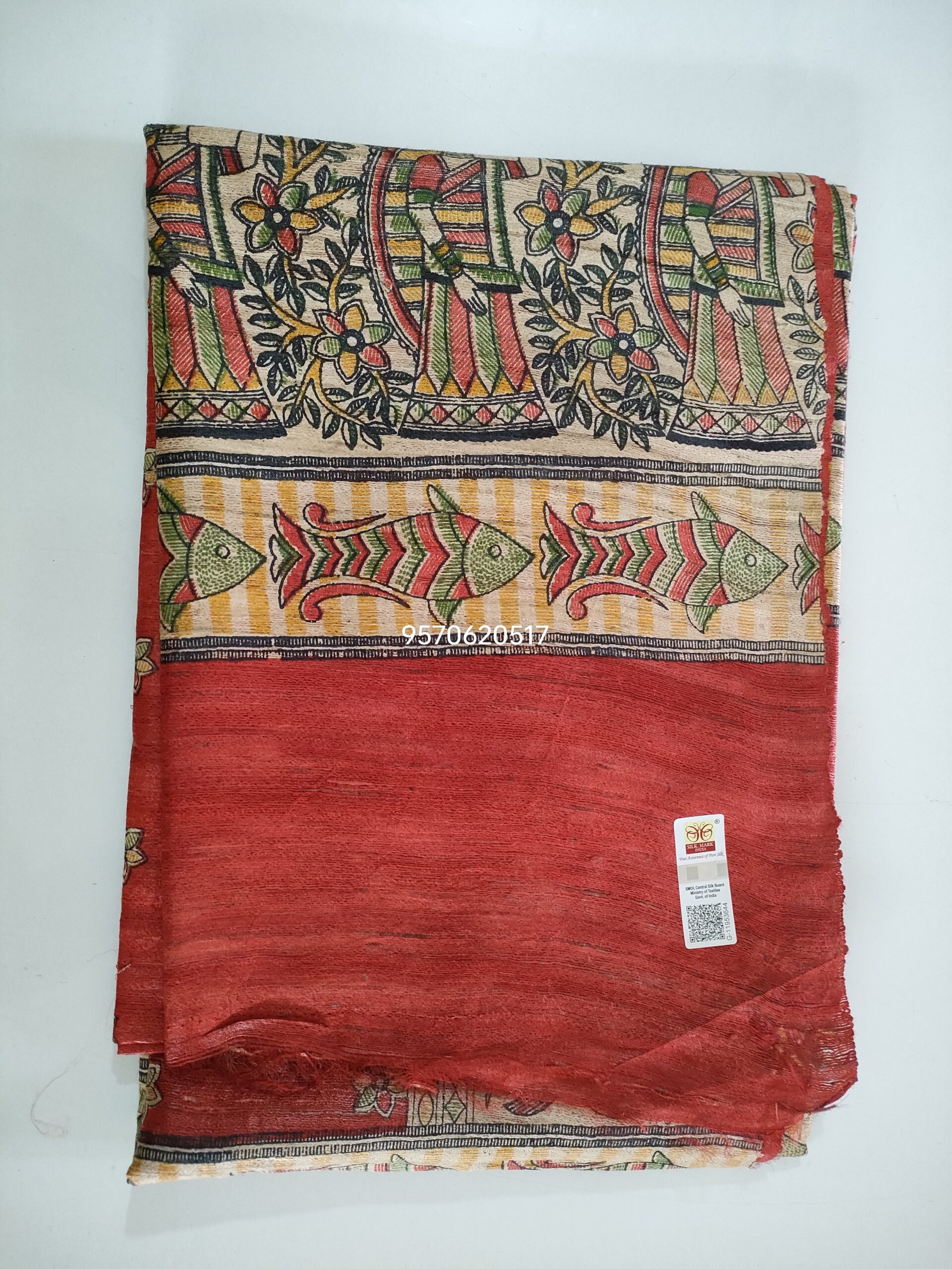 Madhubani hand painted Pure Tussar Silk Sari with blouse piece. Unique design Madhubani Sari.Saree with blouse piece. Madhubani design sari on pure tussar silk.